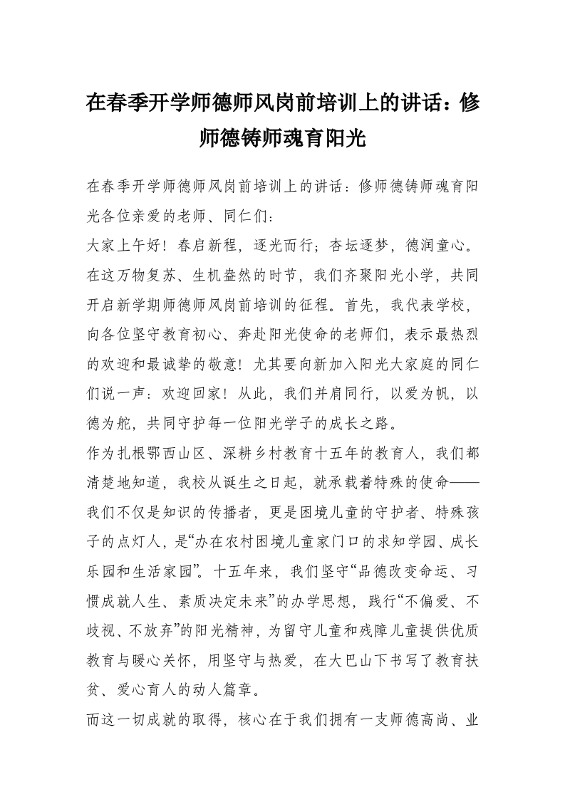 在春季开学师德师风岗前培训上的讲话:修师德铸师魂育阳光