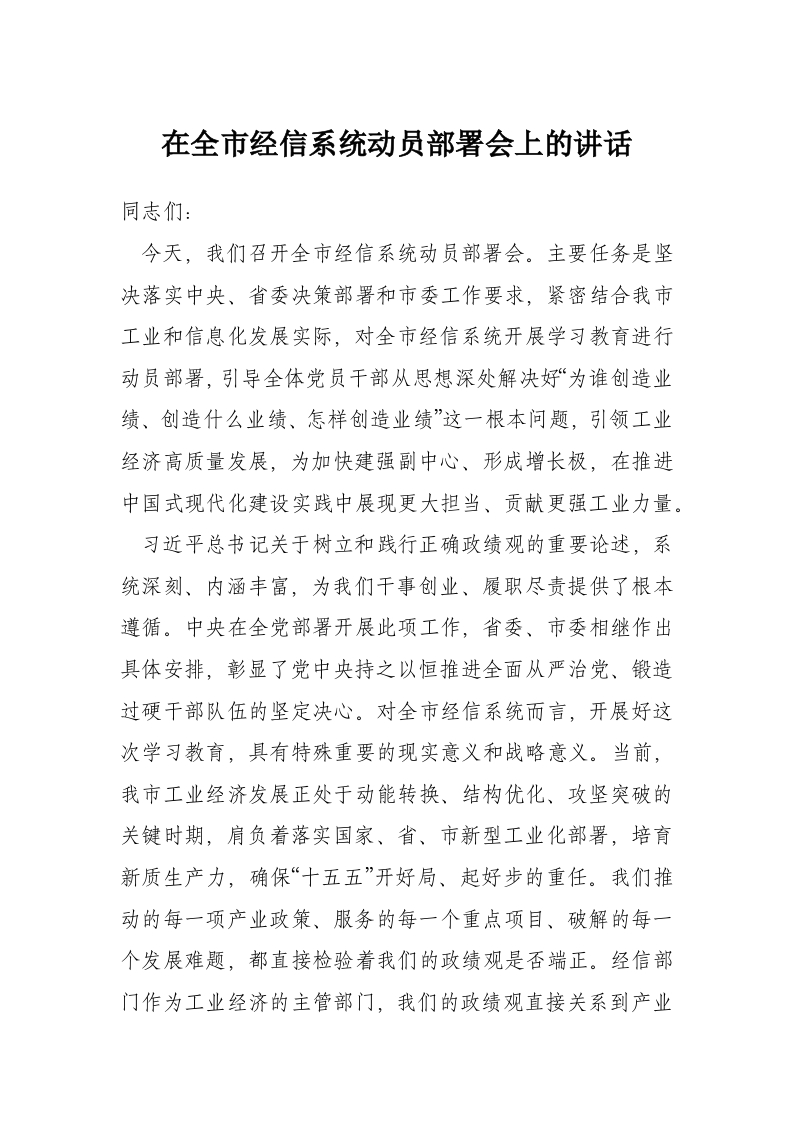在全市经信系统动员部署会上的讲话