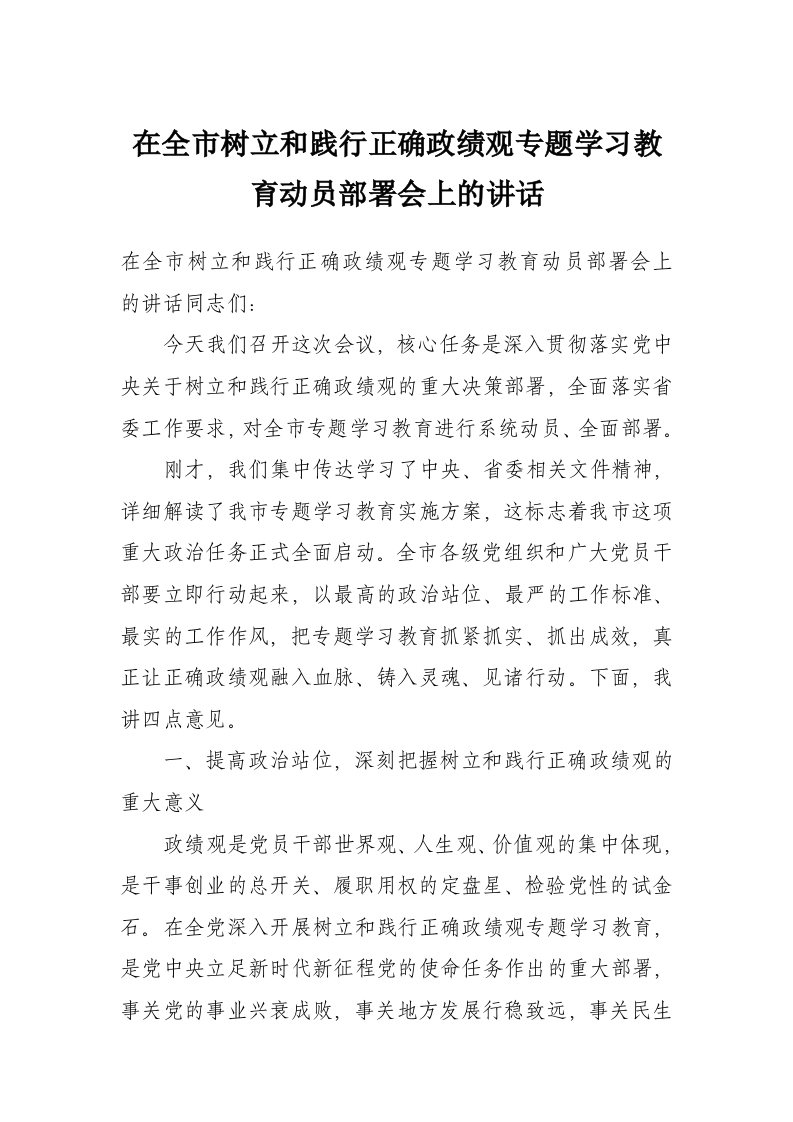 在全市树立和践行正确政绩观专题学习教育动员部署会上的讲话