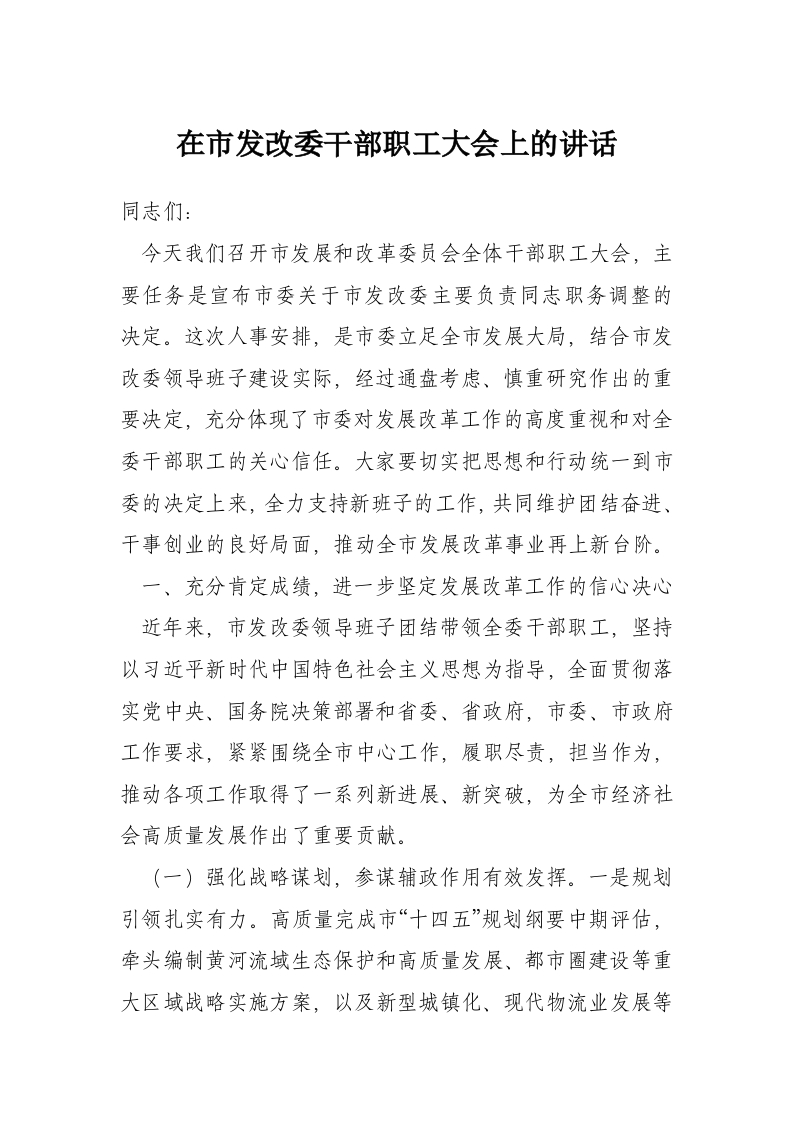 在市发改委干部职工大会上的讲话