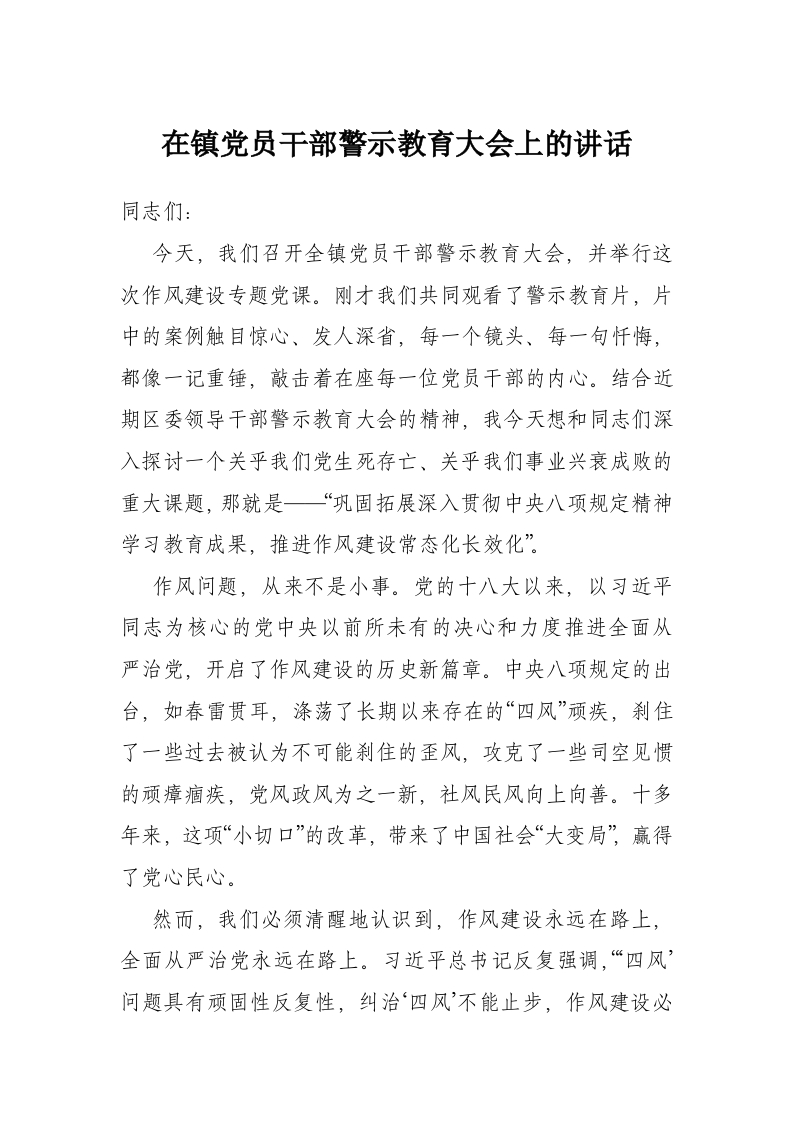 在镇党员干部警示教育大会上的讲话