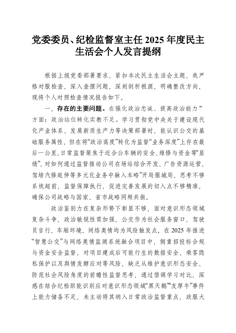 党委委员、纪检监督室主任2025年度民主生活会个人发言提纲