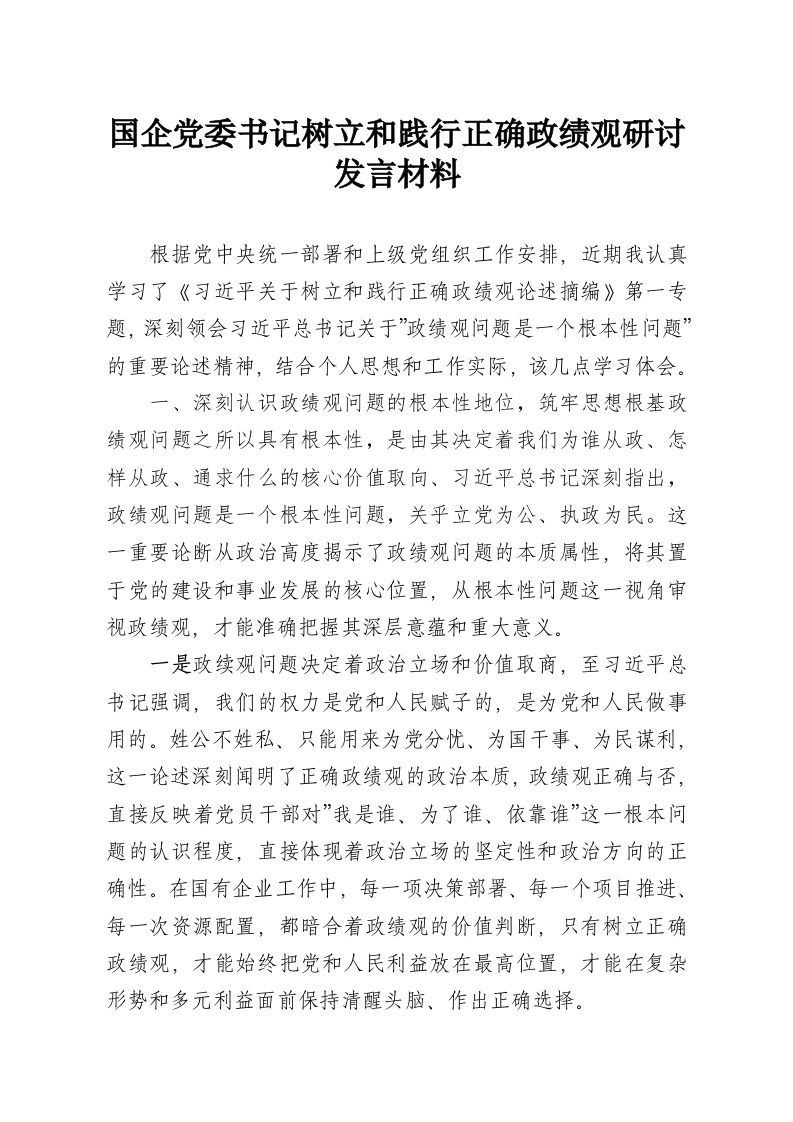 首页材料汇编国企党委书记树立和践行正确政绩观研讨发言材料