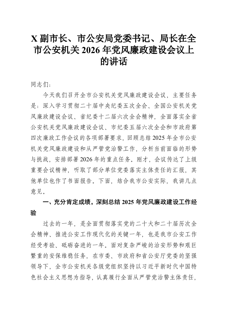 首页讲课讲稿X副市长、市公安局党委书记、局长在全市公安机关2026年党风廉政建设会议上的讲话