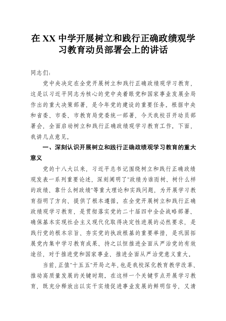 首页讲课讲稿在XX中学开展树立和践行正确政绩观学习教育动员部署会上的讲话