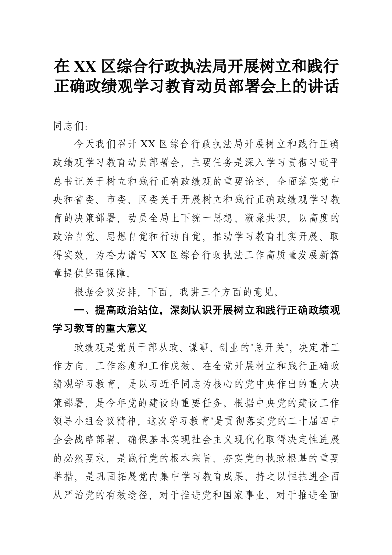 在XX区综合行政执法局开展树立和践行正确政绩观学习教育动员部署会上的讲话
