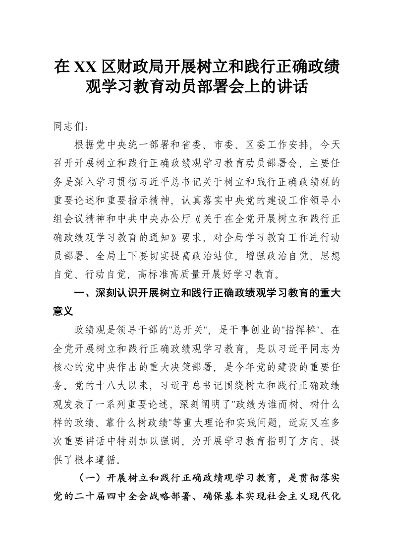 首页讲课讲稿在XX区财政局开展树立和践行正确政绩观学习教育动员部署会上的讲话