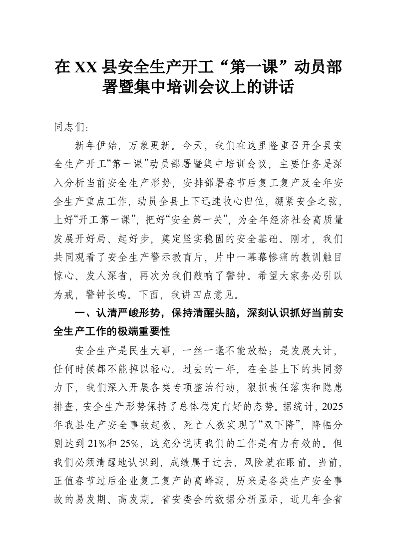 在XX县安全生产开工“第一课”动员部署暨集中培训会议上的讲话