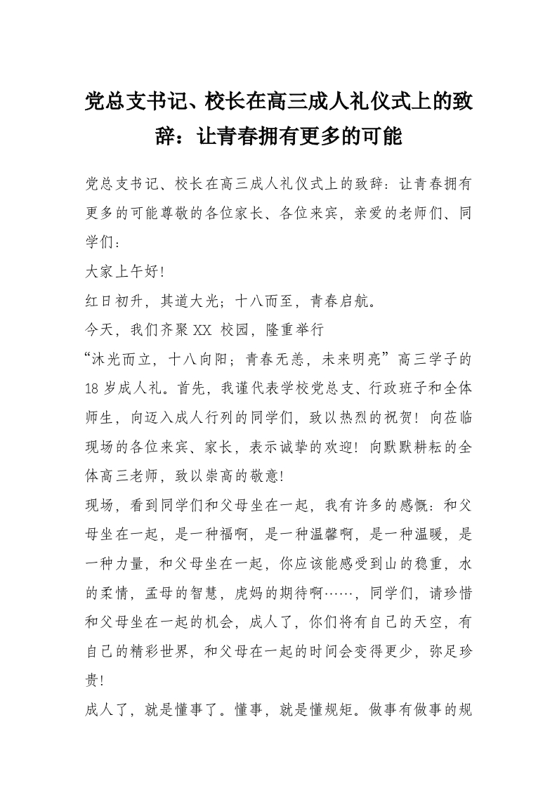 党总支书记、校长在高三成人礼仪式上的致辞:让青春拥有更多的可能